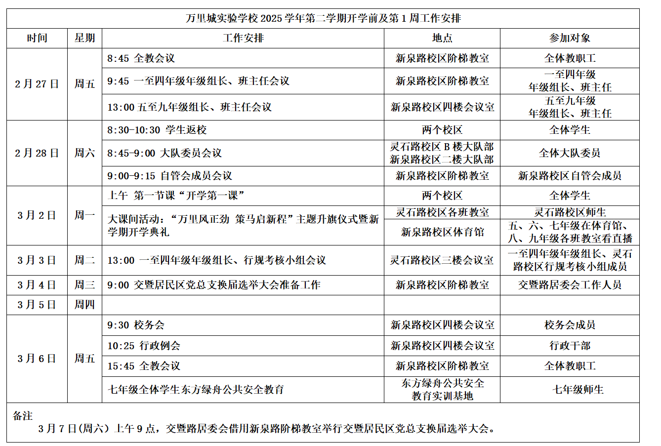 万里城实验学校2025学年第二学期开学前及第1周工作安排
