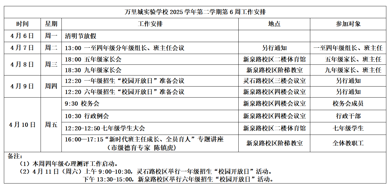 万里城实验学校2025学年第二学期第6周工作安排